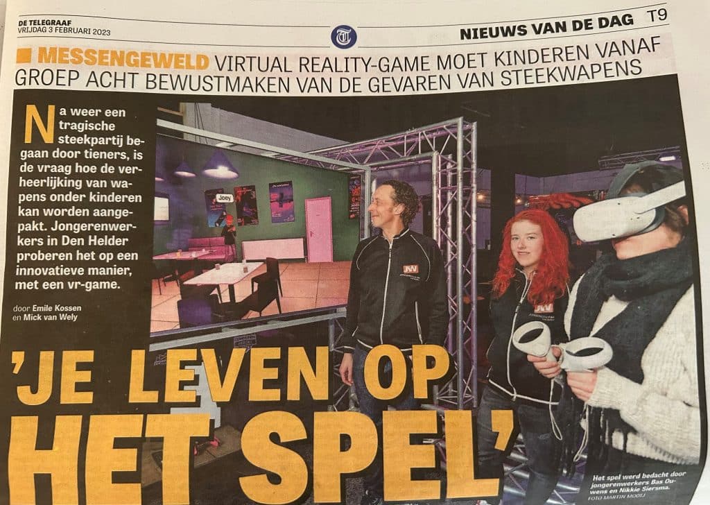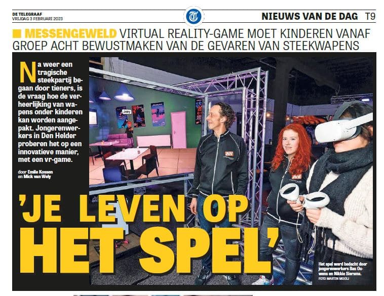 Onze jongerenwerkers Bas Ouwens en Nikkie Siersma stonden vrijdag 3 februari met de innovatieve VR-game ReAction tegen steekgeweld onder jongeren met een hele pagina in de Telegraaf.